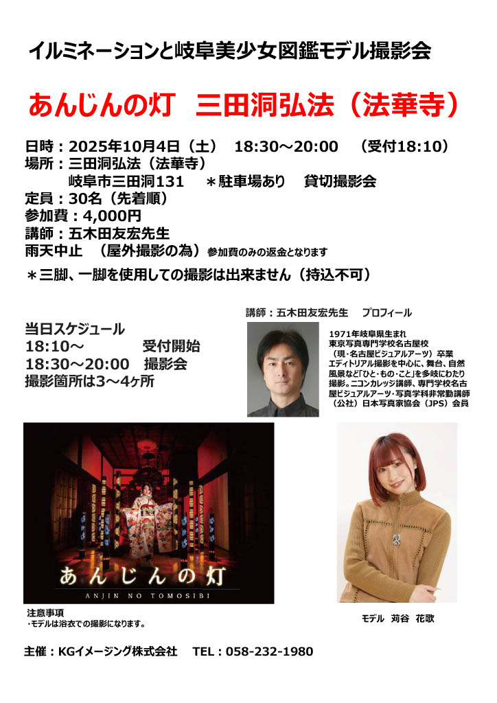 2025.09.24 イルミネーションと岐阜美少女図鑑モデル撮影会 あんじんの灯 三田洞弘法(法華寺) お問合せはKGイメージング株式会社まで TEL:058-232-1980 イルミネーションと岐阜美少女図鑑モデル撮影会 あんじんの灯 三田洞弘法(法華寺) 前の記事